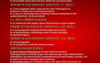 Sunnudagaskóli kl. 11:00. Að þessu sinni verður kirkjbrall í sunnudagaskólanum. Í kirkjubralli komum við saman og eigum skemmtilega samveru, föndrum og bröllum ýmislegt. Aðventuhátið Lindakirkju er kl. 17 og er miðasala á lindakirkja.is. Ath. vegna [...]