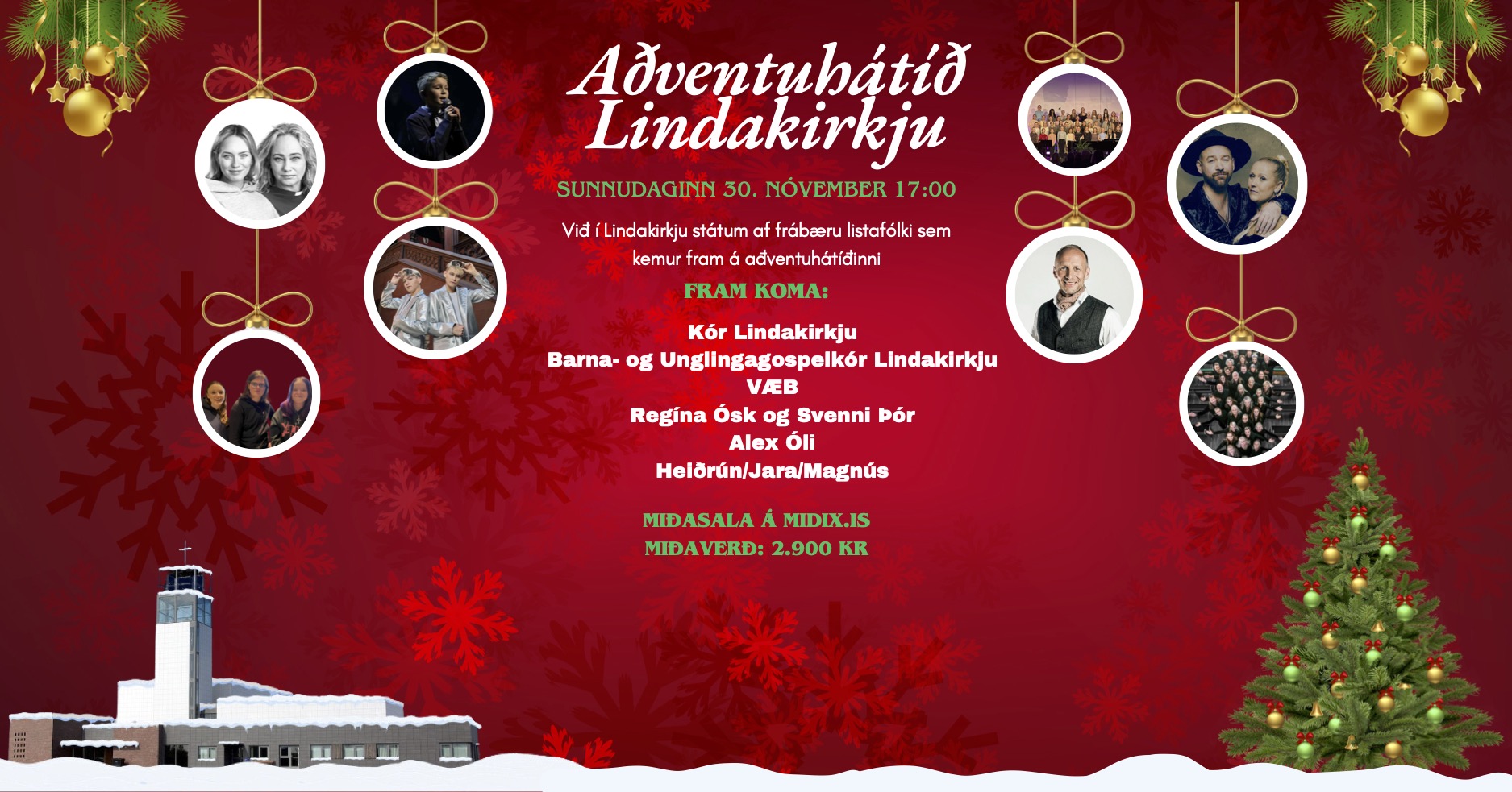 Við í Lindakirkju státum af frábæru listafólki sem kemur fram á aðventuhátíðinni okkar: ✨ Kór Lindakirkju ✨ Barna- og unglingagospelkór Lindakirkju ✨ VÆB ✨ Regína Ósk & Svenni Þór ✨ Alex Óli ✨ Heiðrún, Jara & Magnús 🎼 Tónlistarstjóri: Óskar Einarsson Miðaverð: 2.900 [...]